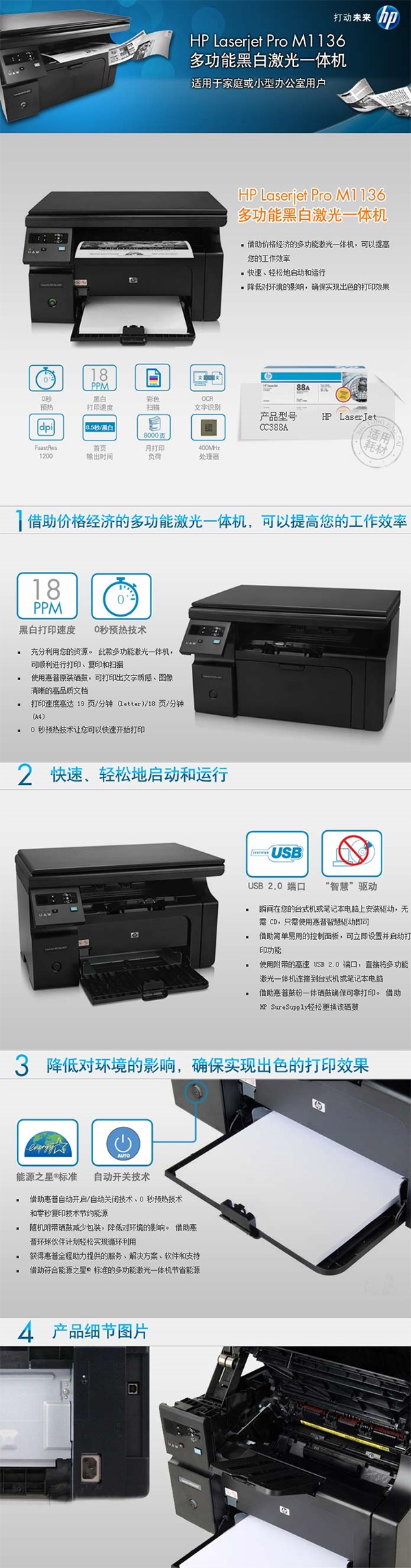 惠普HP LaserJet Pro M1136 多功能黑白激光一體機(jī)