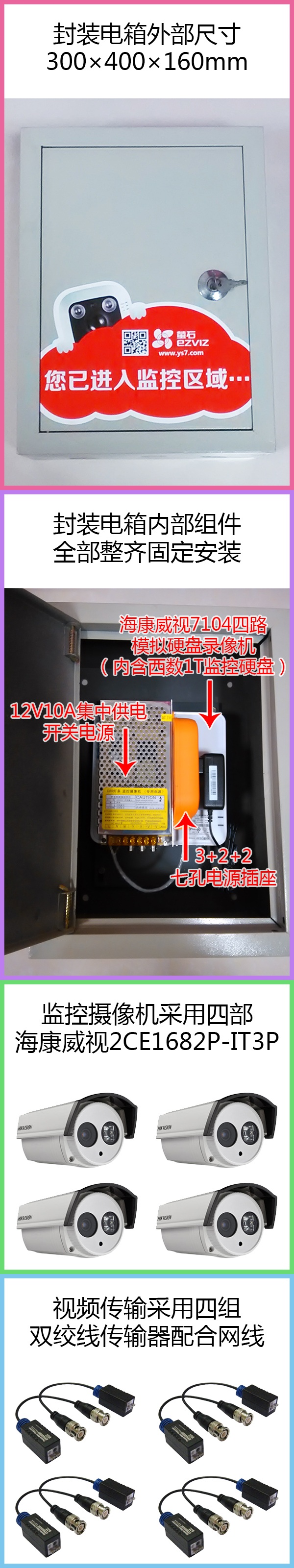 四路監(jiān)控套裝,內(nèi)含7104四路模擬硬盤錄像機(jī)一臺(tái)、西數(shù)1T監(jiān)控硬盤一塊、2V10A集中供電開關(guān)電源一個(gè)、3+2+2七孔電源插座一只、400×300×160mm電箱一個(gè)、監(jiān)控?cái)z像機(jī)四部、雙絞線傳輸器四組、12V電源公頭四支、純銅網(wǎng)線50米及攝像機(jī)支架四支,僅售人民幣1299元,徐州市三環(huán)路以內(nèi)1799元上門包安裝,另加700元可得19寸顯示器及顯示器墻面掛架一套。